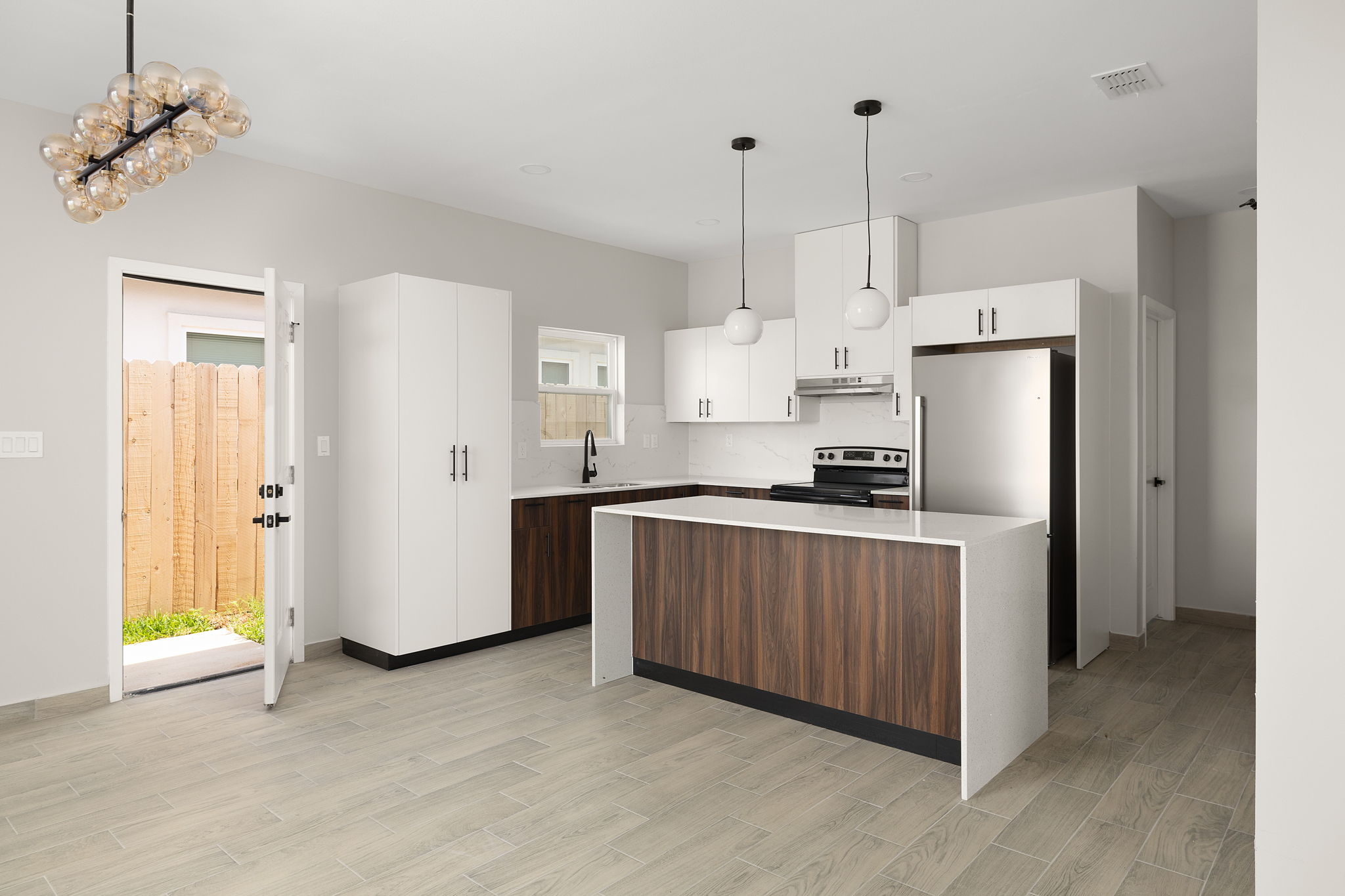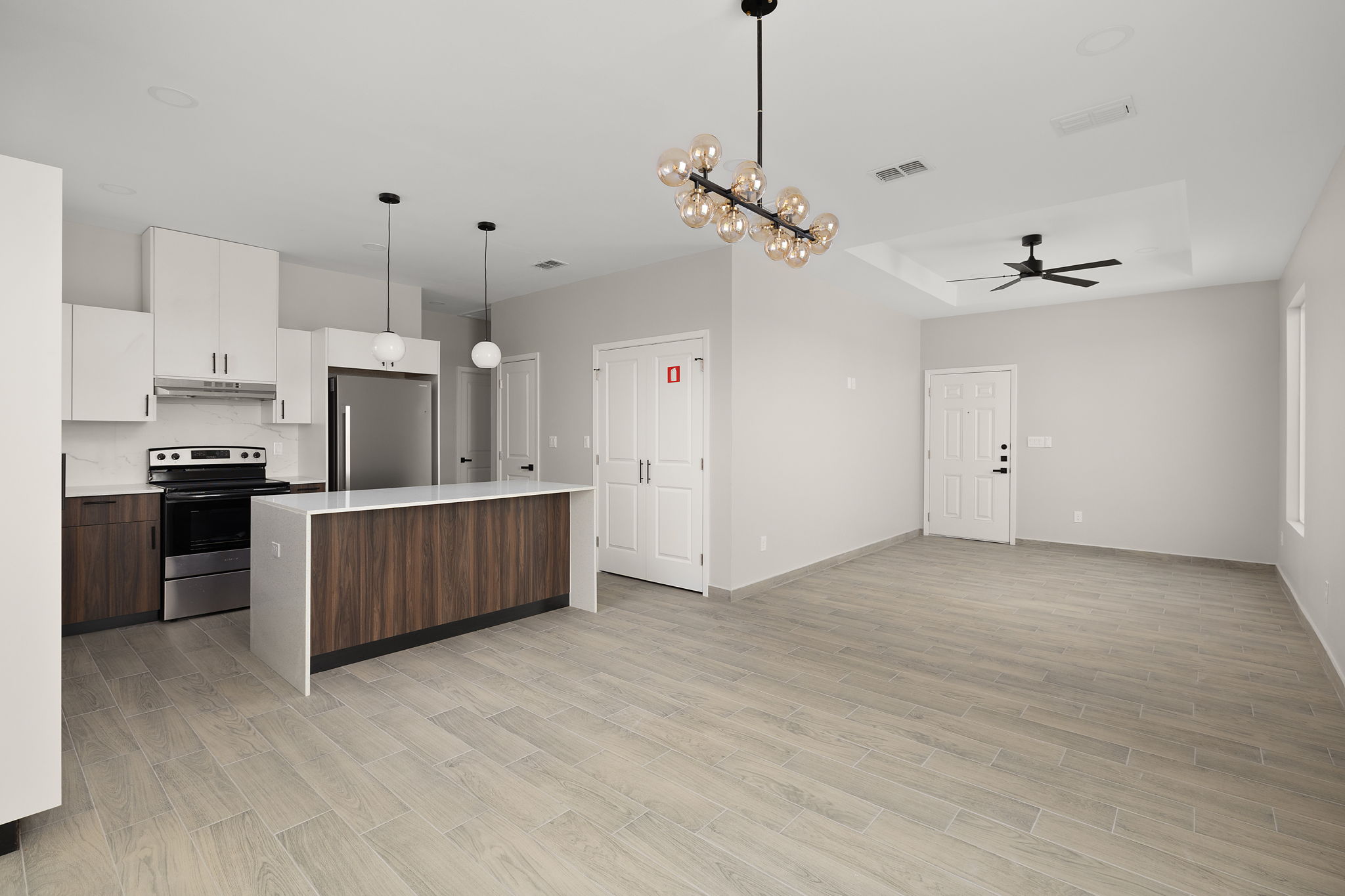 The residence features a 3-bedroom, 2-bath open-concept floor plan designed for comfortable modern living. The kitchen and living areas flow seamlessly, creating a functional and inviting space. All major appliances are included—refrigerator, stove, microwave, washer, and dryer—making the unit truly move-in ready.